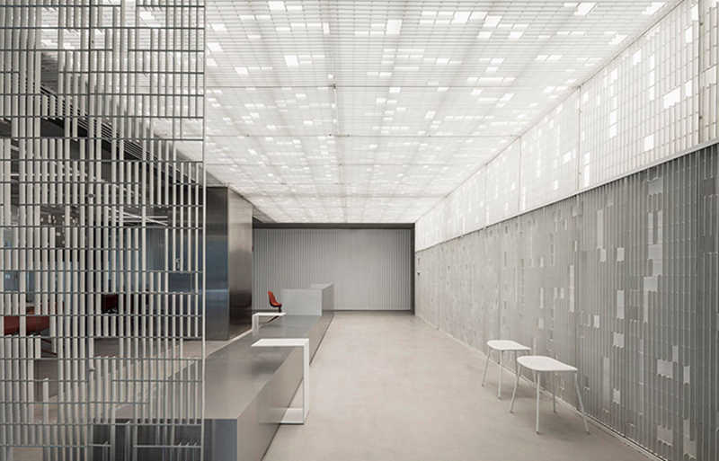 在为餐具公司的家基地设计的新空间中,餐厅陈列室和办公室在光明和黑暗的对比中共存...